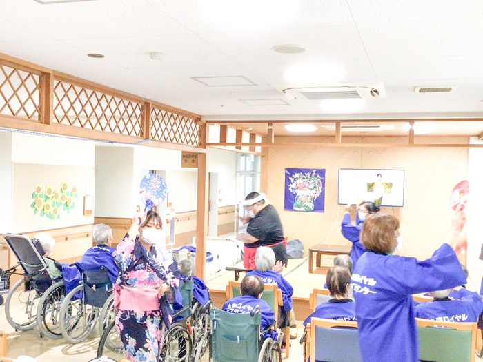 感染対策等の観点から、今年は各フロア毎の実施を検討し、職員が地域の盆踊りを踊りながら順にフロアを巡り、入所者の皆さまに少しでも夏祭りの雰囲気を感じて頂けたらと企画した。