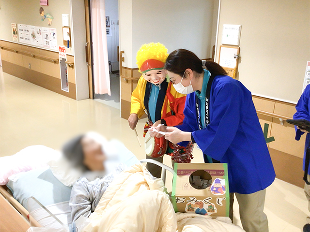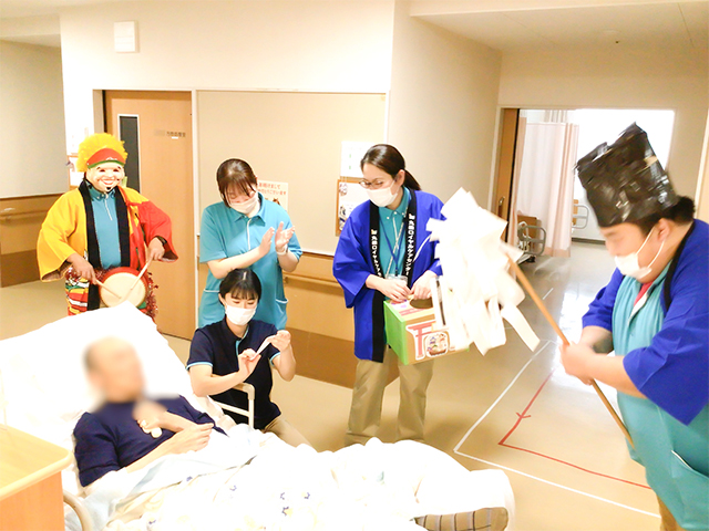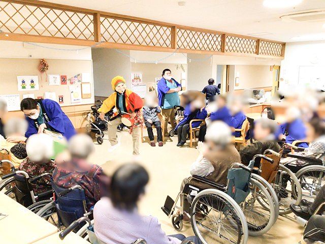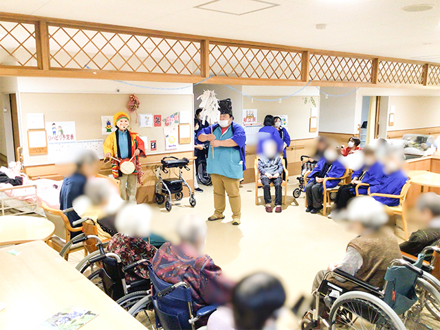 R8.1.5(月)、施設全体行事として「新年会」を開催した。今年は各フロア毎に出し物を考え、おみくじ等、お正月ならではのイベントを職員が工夫を凝らし、利用者の皆さまにご提供させていただいた。 利用者さまの笑顔も数多く見られ、和やかなうちに無事新年会を終えることができた。