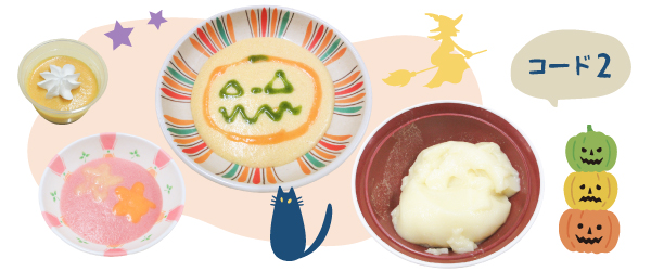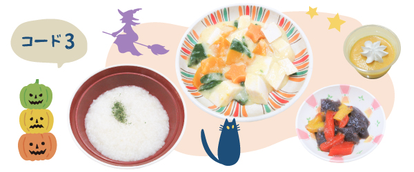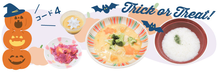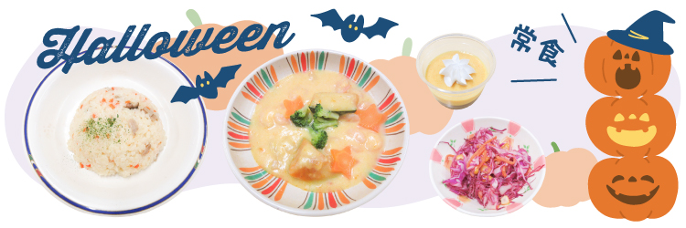 ハロウィンといえば、カボチャ。10月の行事食では、カボチャをメインにした献立に。黄色・オレンジ・紫と、ハロウィンをイメージさせる色味を意識しました。