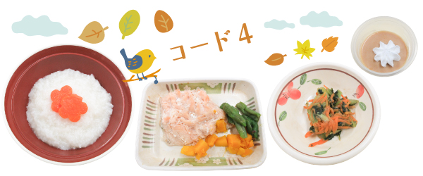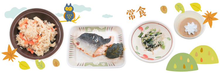 きのこ、鮭、主菜の付け合わせに木の葉型のカボチャを使用し、秋を感じられるような献立にしました。患者さまにも「秋を感じられる献立だった!」と満足していただけました。