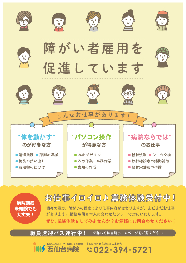 当院では、障がいを持つ方の雇用を促進しており、病院勤務未経験の方も歓迎しております。実際に、障がい者雇用で採用された複数名の職員が当院で活躍中です。
