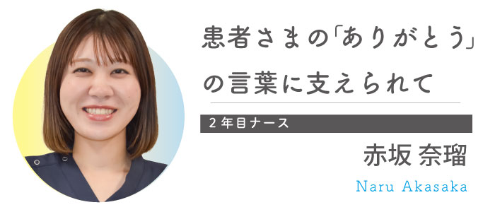 受け持ちの看護師として、ご本人・ご家族が望む退院後の生活に寄り添えるよう、多職種とも協力しながら仕事をしています。
