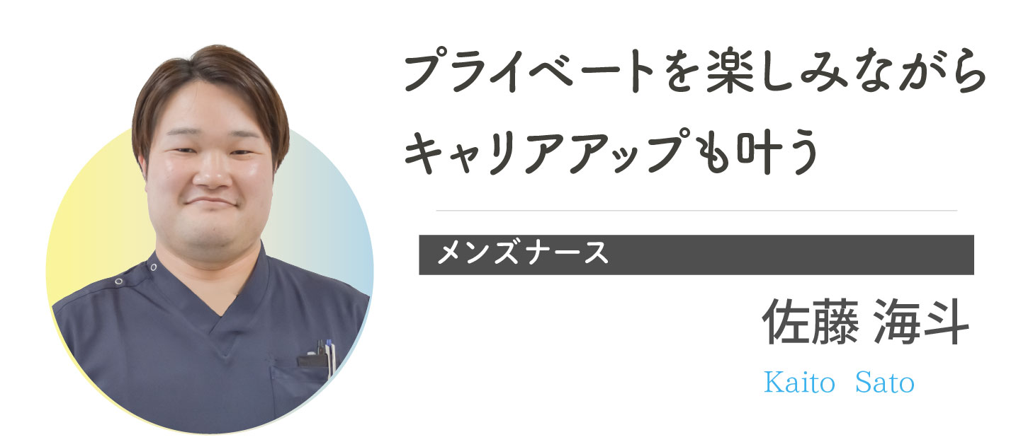 メンズナースとして、若い男性の患者さまが入院した時は特に話しやすい存在となれるよう率先して対応しています。プライベートでは、家族や子どもとの時間をとれるように配慮してもらい、充実した休日を過ごしています。院内のサッカー部にも所属し、他部署の仲間と出かけることもあります。現在、主任という役職ですが、院内外の研修に参加でき、キャリアアップを目指して学びながらスタッフ教育や業務改善に取り組んでいます。メンズ仲間が増えると嬉しいので、興味のある方は一度見学にお越しください。